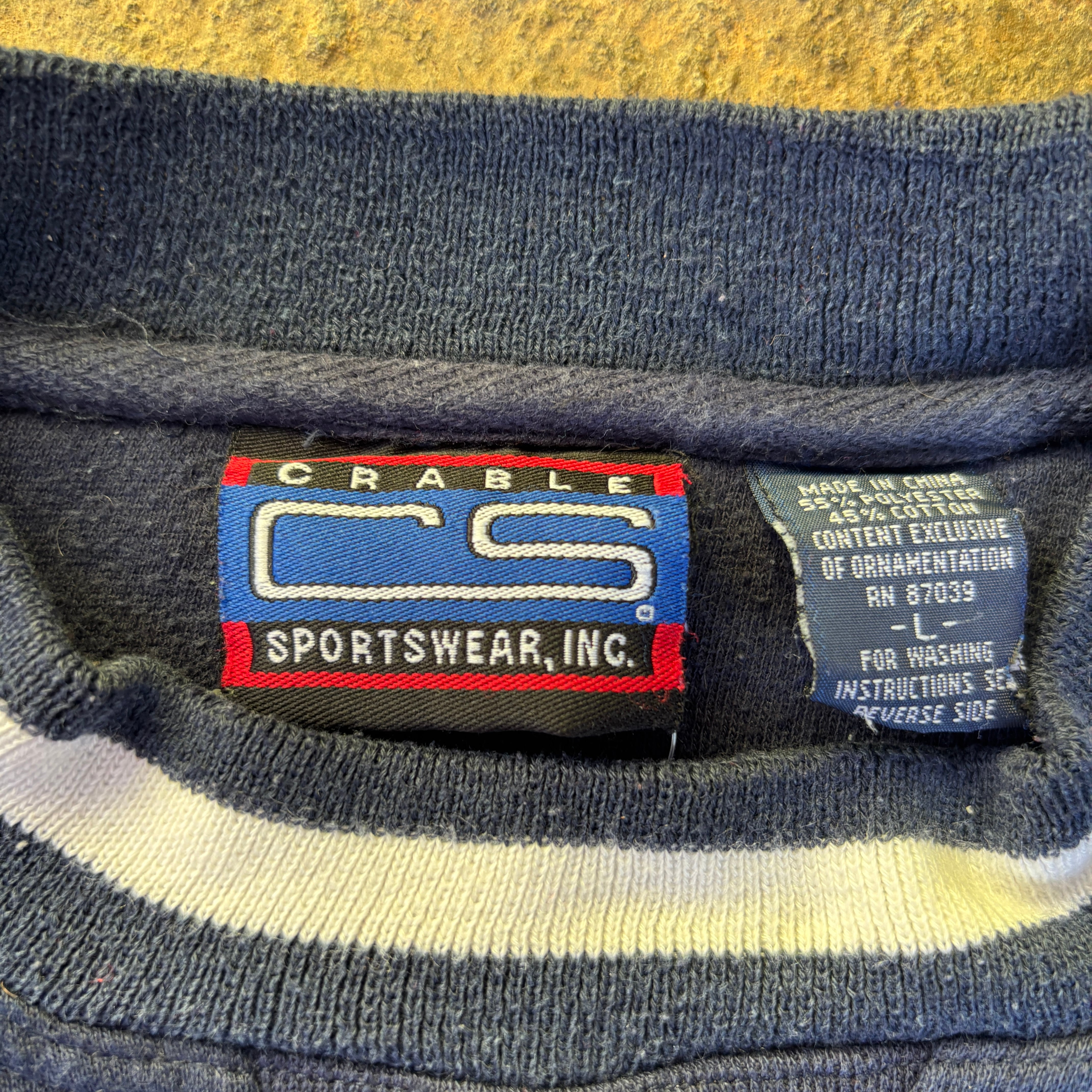 ネイビーのボディに映える首元と袖口のホワイトリブラインが、スポーティかつクラシックな印象を演出。肉厚な生地感と、90s特有の肩が落ちるワイドなシルエットが魅力的です。