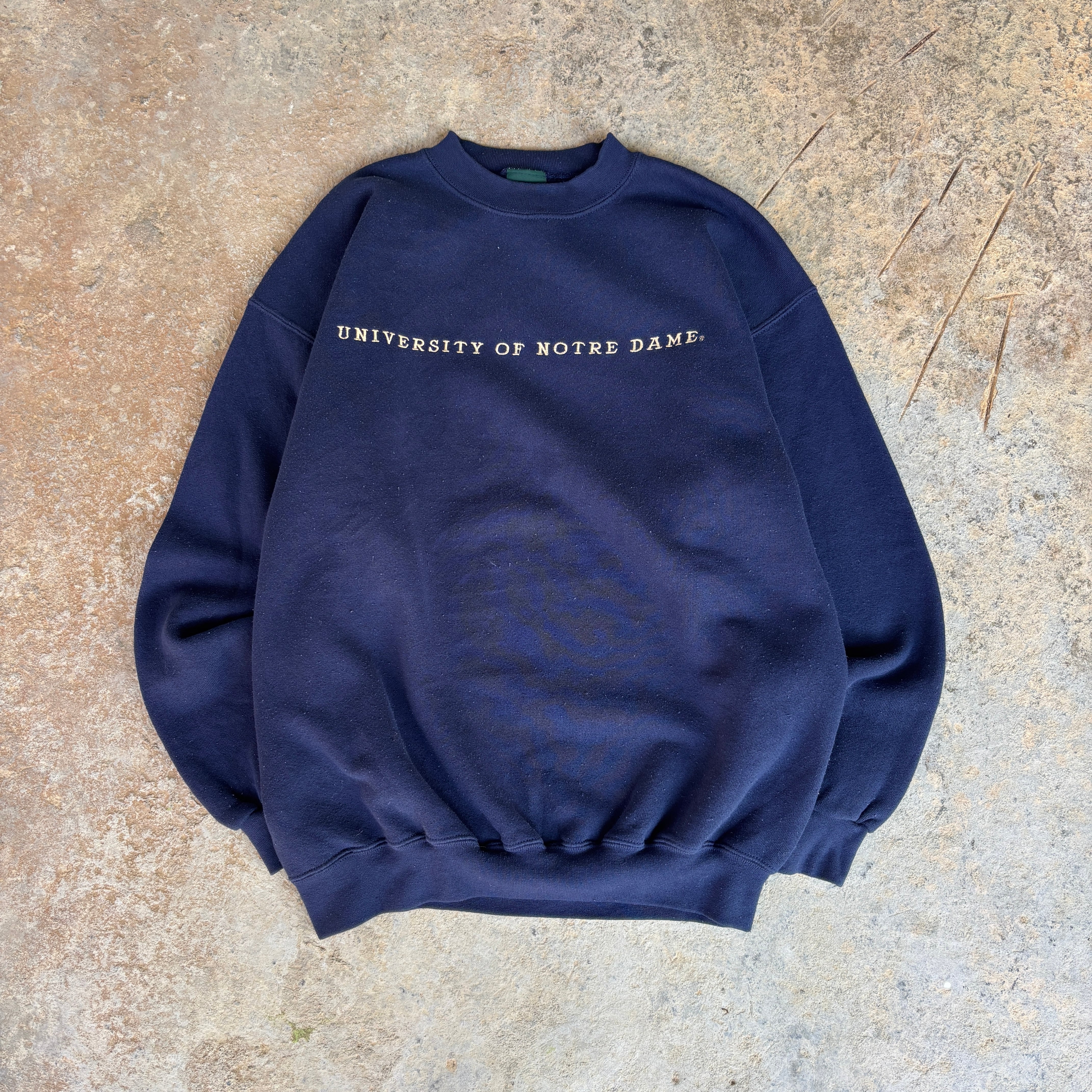 アメリカの名門、ノートルダム大学のロゴが胸元にあしらわれたカレッジスウェットです! ネイビーのボディカラーにゴールドの刺繍でシンプルながらも洗練された存在があり、どんなスタイルにも合わせやすい一着となっています。 肩幅約60cm 身幅約58cm 着丈約67cm 袖丈約53cm 20648452