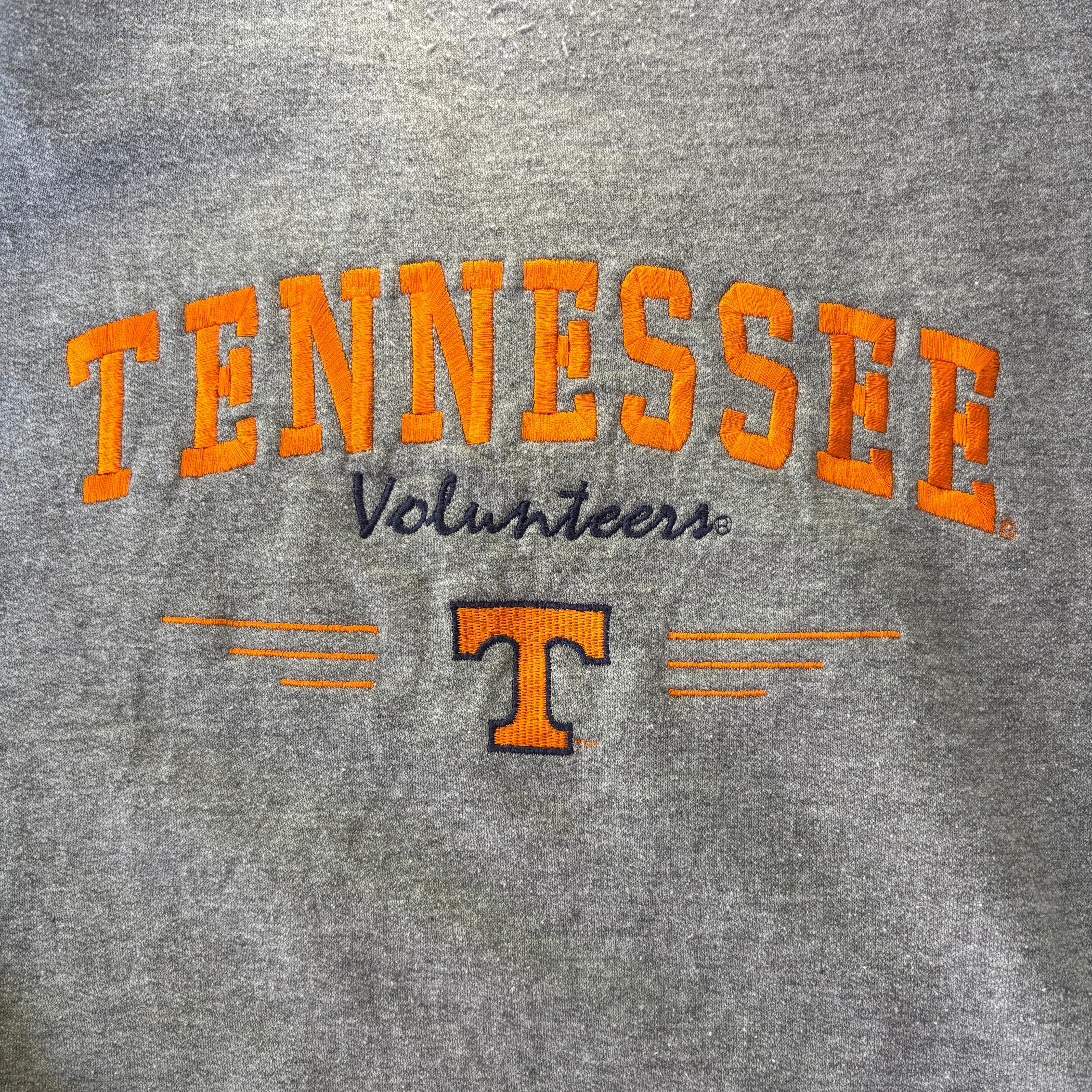 テネシー大学のヴィンテージスウェットです。 鮮やかなオレンジのチームカラーが霜降りグレーのボディによく映える、王道のカレッジデザイン。フロントには象徴的な「T」ロゴと「Volunteers」の文字が立体感のある刺繍で施されています! 肩幅約61cm 身幅約63cm 着丈約71cm 袖丈約57cm 20648461