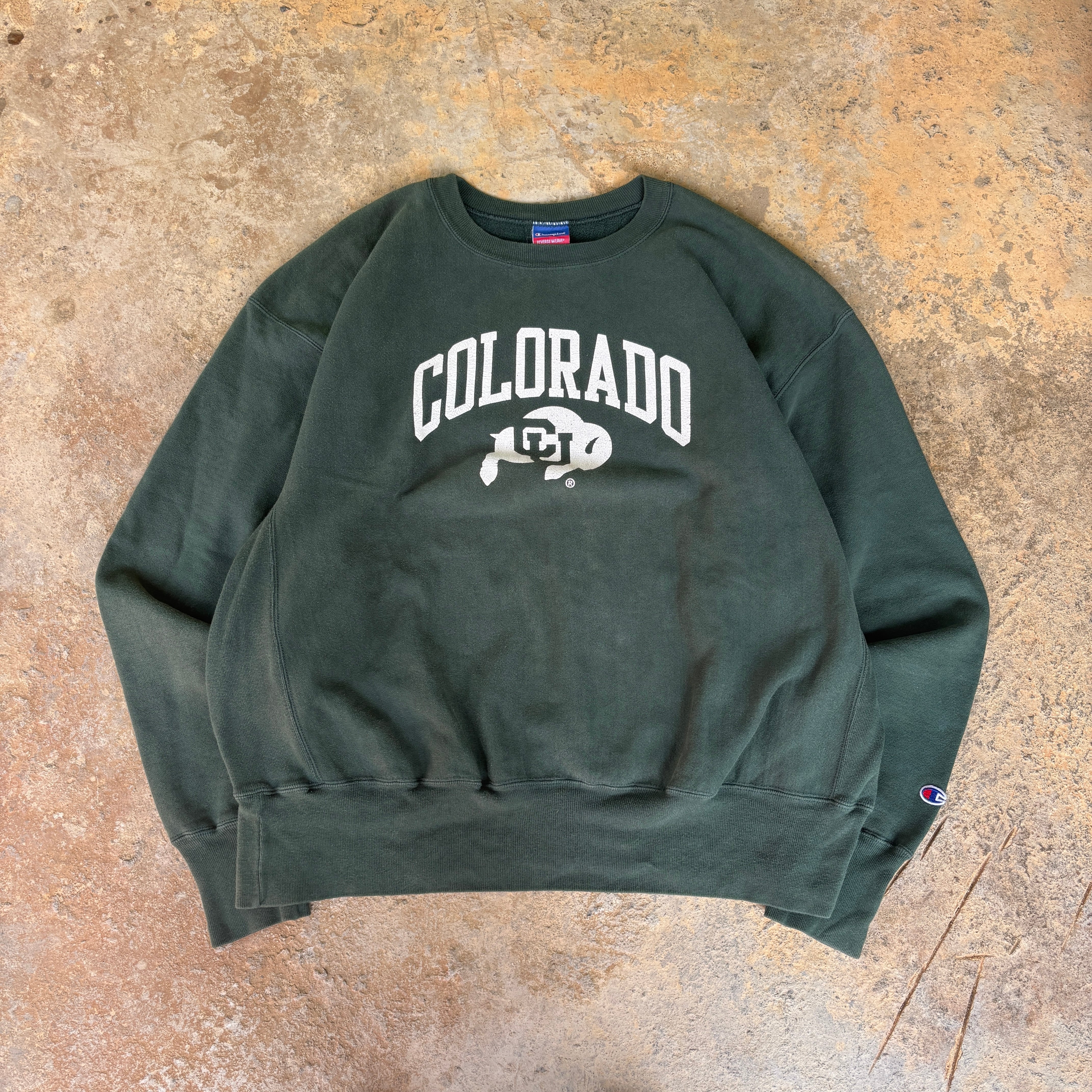 Champion REVERS WEAVE チャンピオンのヴィンテージ リバースウィーブ! モスグリーンのボディカラーに、コロラド大学のロゴがプリントされたスウェットです。 リバースウィーブは脇の下にリブが配置され、縮みにくく動きやすいのが特徴です。 XXL表記 肩幅約71cm 身幅約70cm 着丈約74cm 袖丈約67cm 20648463