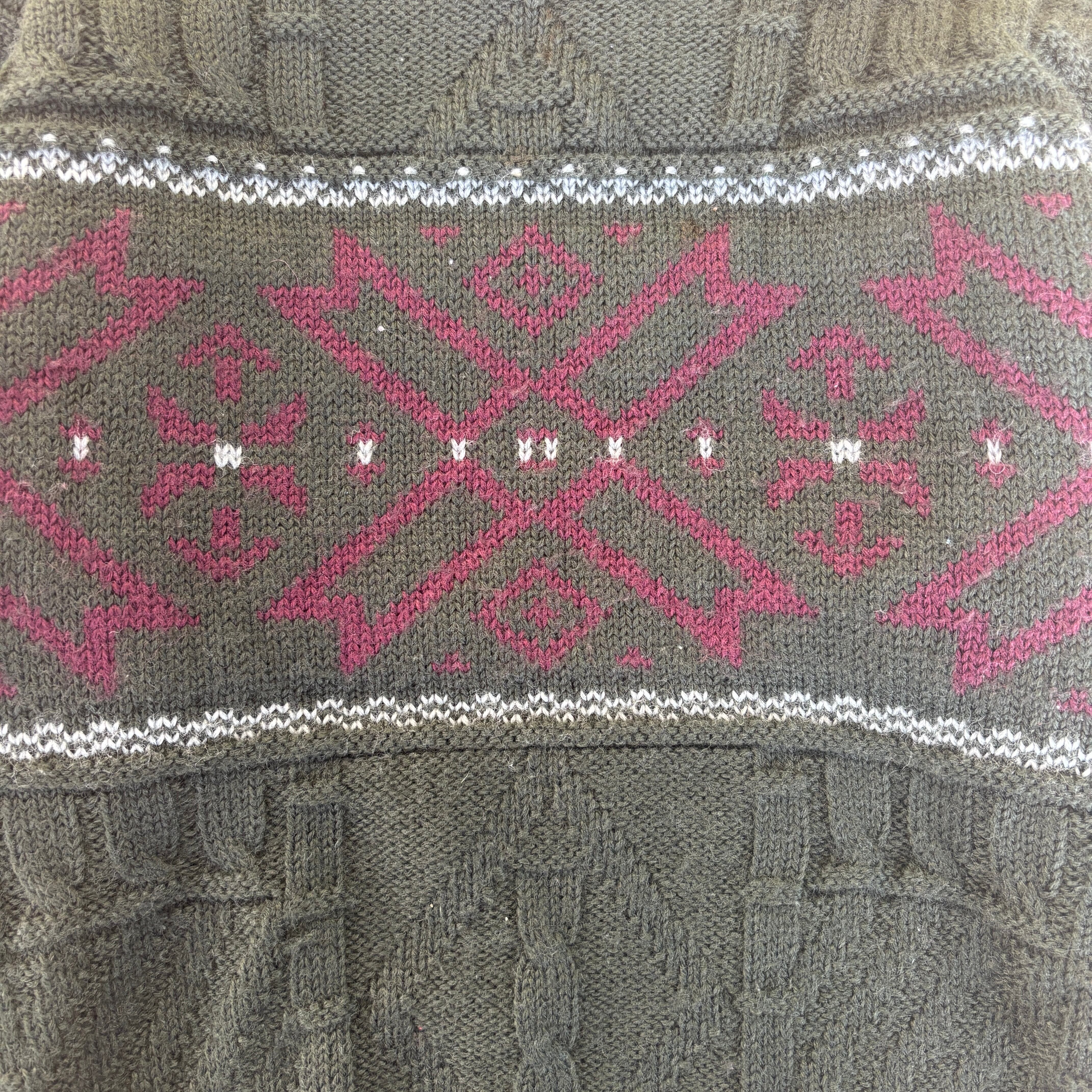 深く落ち着いたダークグリーンをベースに、ワインレッドの幾何学模様が映える、表情豊かなニットです。 立体的なケーブル編みは総柄ではなく、編み地に変化をつけることで、奥行きのある仕上がりになっています。 首元はリブ編みの配色切り替えになっており、レイヤードスタイルのアクセントにも! 肩幅約54cm 身幅約53cm 着丈約63cm 袖丈約54cm 20648473