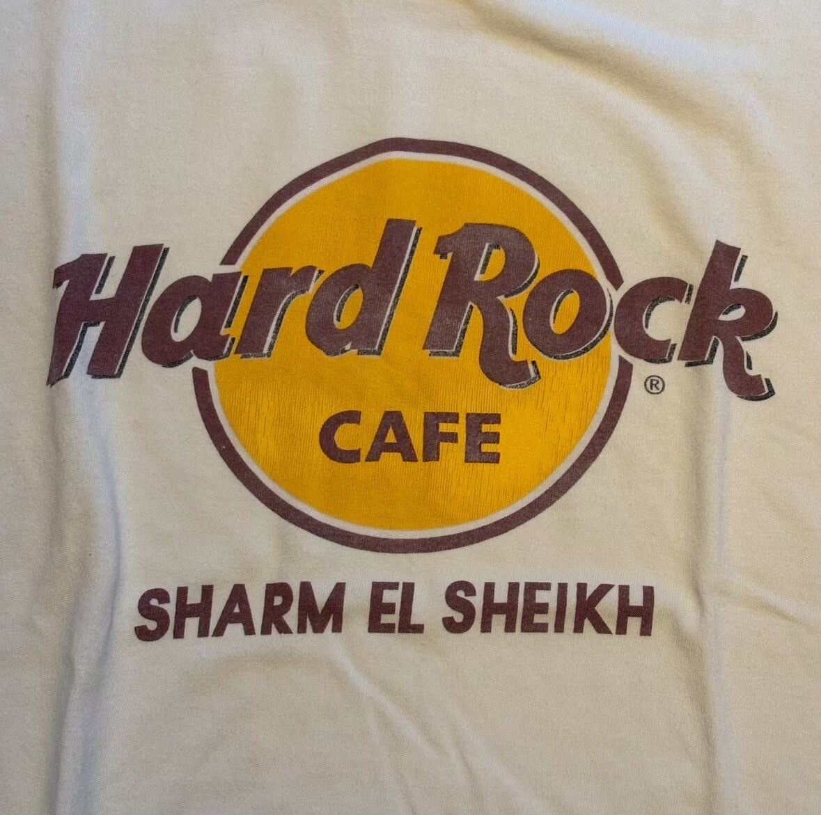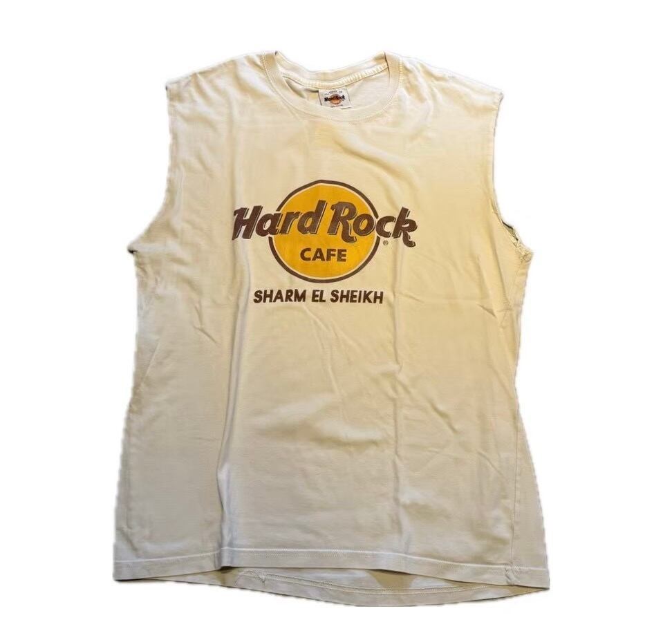 Hard Rock Cafe(ハードロックカフェ)の「SHARM EL SHEIKH(シャルム・エル・シェイク)」店限定のヴィンテージTシャツ、あるいは袖がカットされたタンクトップ(ノースリーブ)です。 肩幅約47cm 身幅約54cm 着丈約70cm 20643753