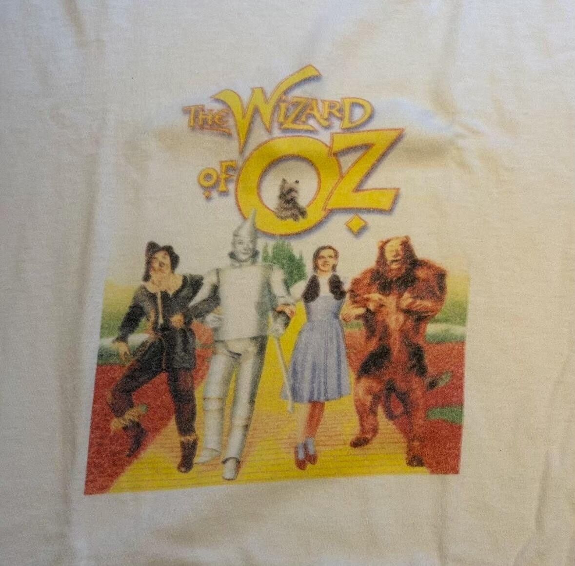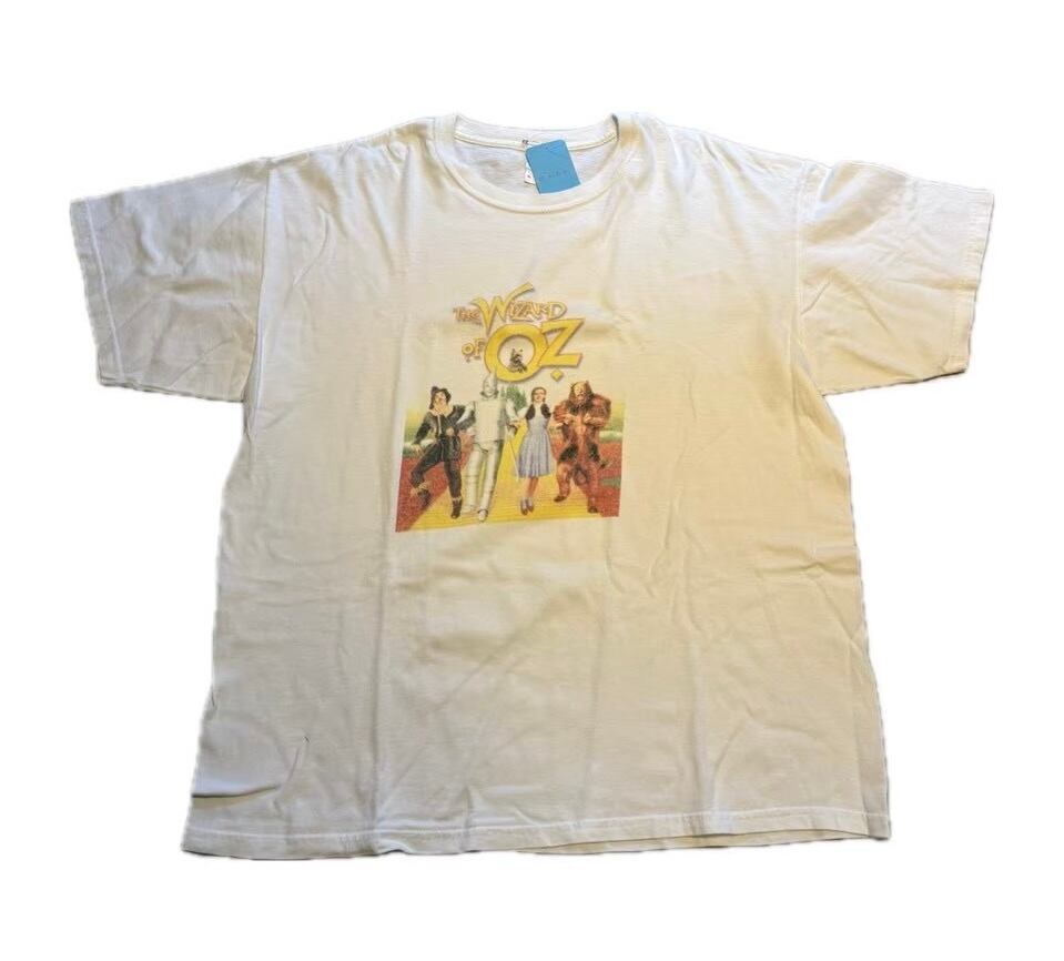 不朽の名作映画『オズの魔法使い』(The Wizard of Oz)のメインキャラクターたちがプリントされたTシャツです。 このデザインは、ドロシー、かかし、ブリキ男、臆病なライオンの4人が、エメラルド・シティへと続く「黄色いレンガの道」を歩いている、映画の象徴的なワンシーンを再現したものです。 肩幅約60cm 身幅約62cm 着丈約73cm 袖丈約22cm 20643754