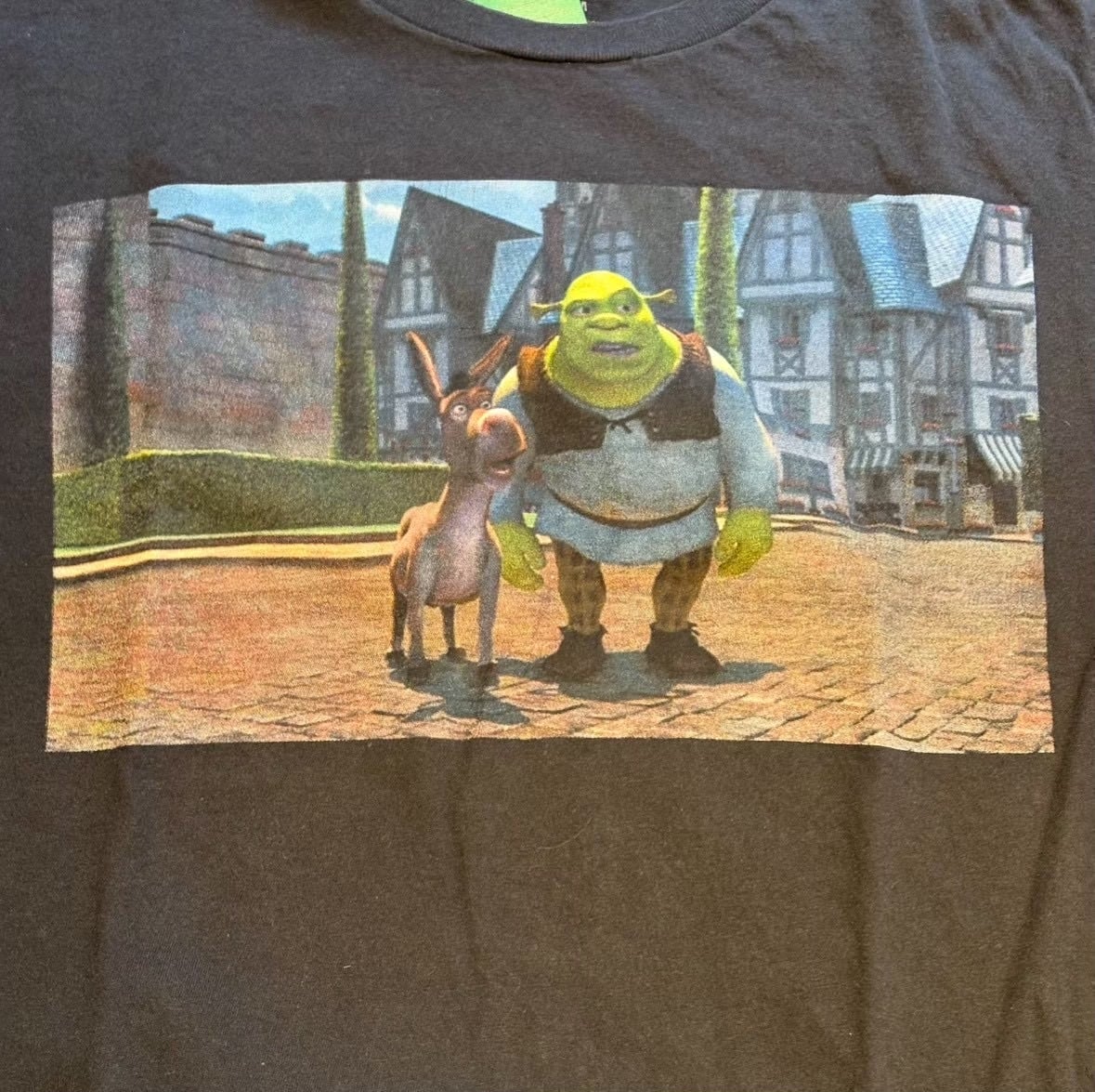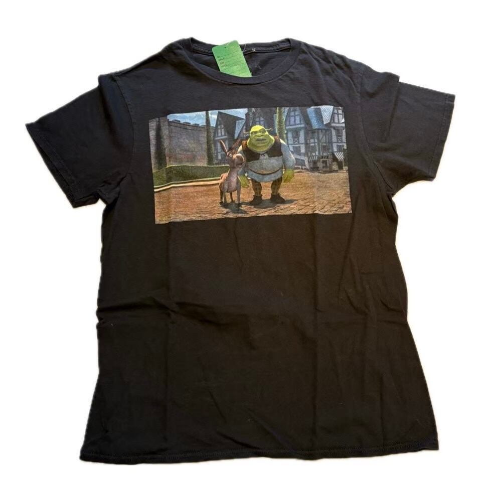 映画『シュレック』のワンシーン(シュレックとロバのドンキーが並んでいる場面)を前面に大きくプリントした、公式ライセンス品のムービーTシャツです。 肩幅約42cm 身幅約49cm 着丈約64cm 袖丈約18cm 20643757
