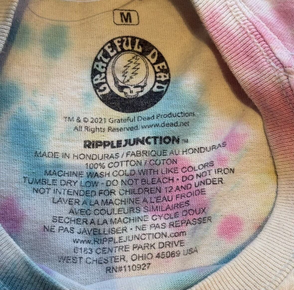 アメリカのロックバンド、グレイトフル・デッド (Grateful Dead) のオフィシャルライセンスTシャツです。 バンドの象徴的なキャラクターである「ダンシングベア」が、地球や太陽、三日月、土星などの天体モチーフと共に円状に描かれています。 白をベースにピンクや青、黄色が混ざり合った鮮やかなタイダイ(絞り染め)柄が特徴です。 20643759