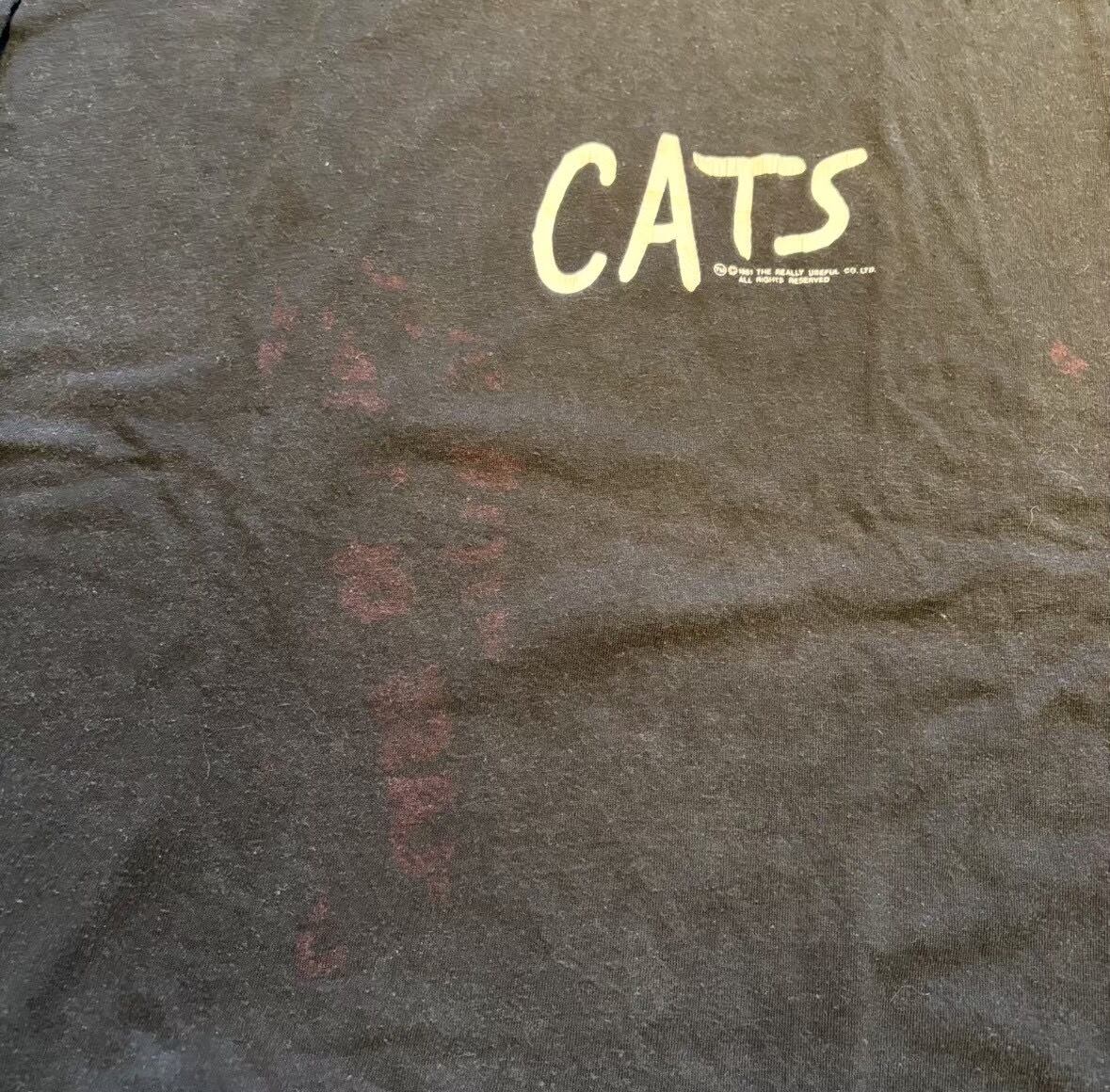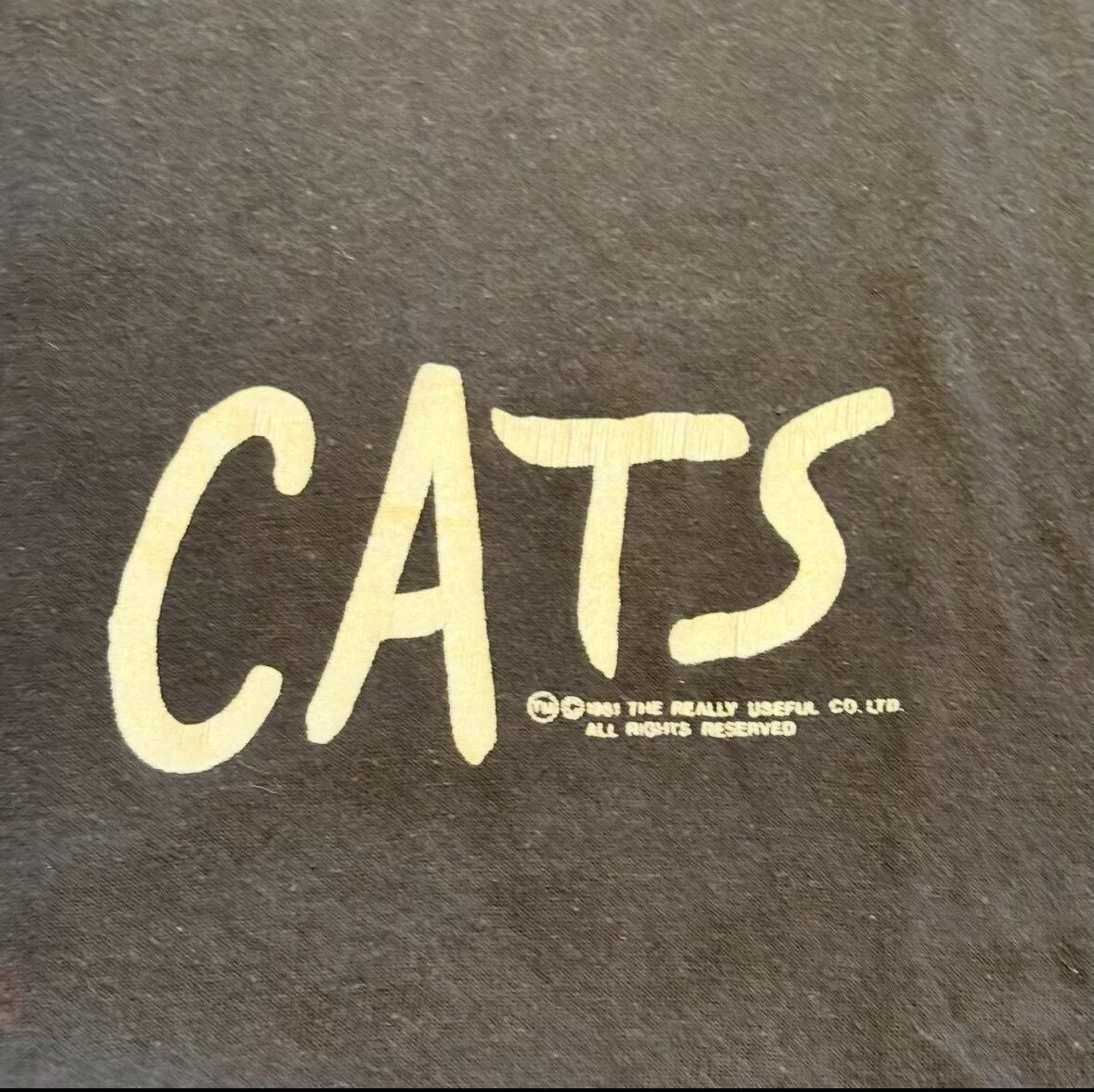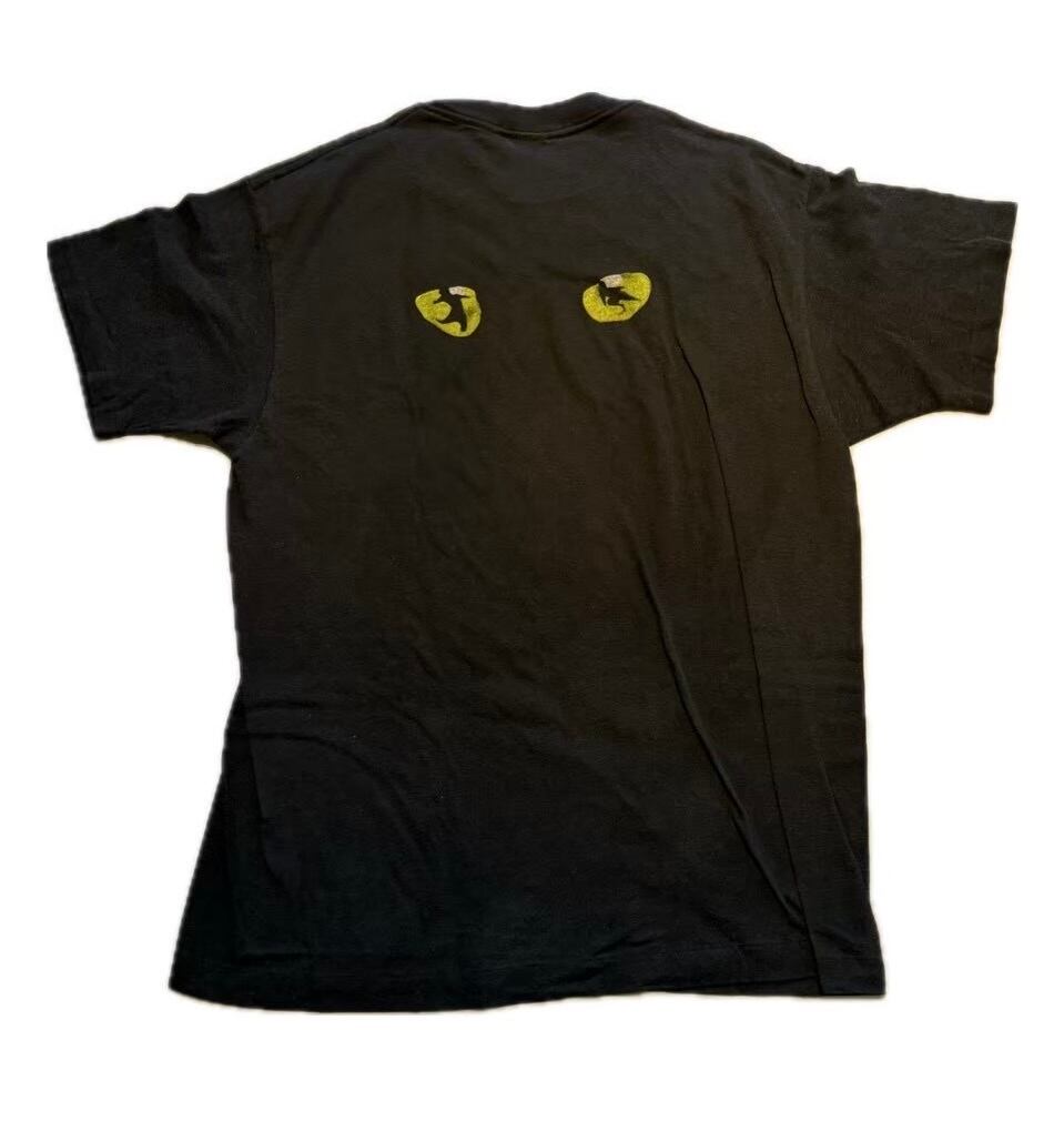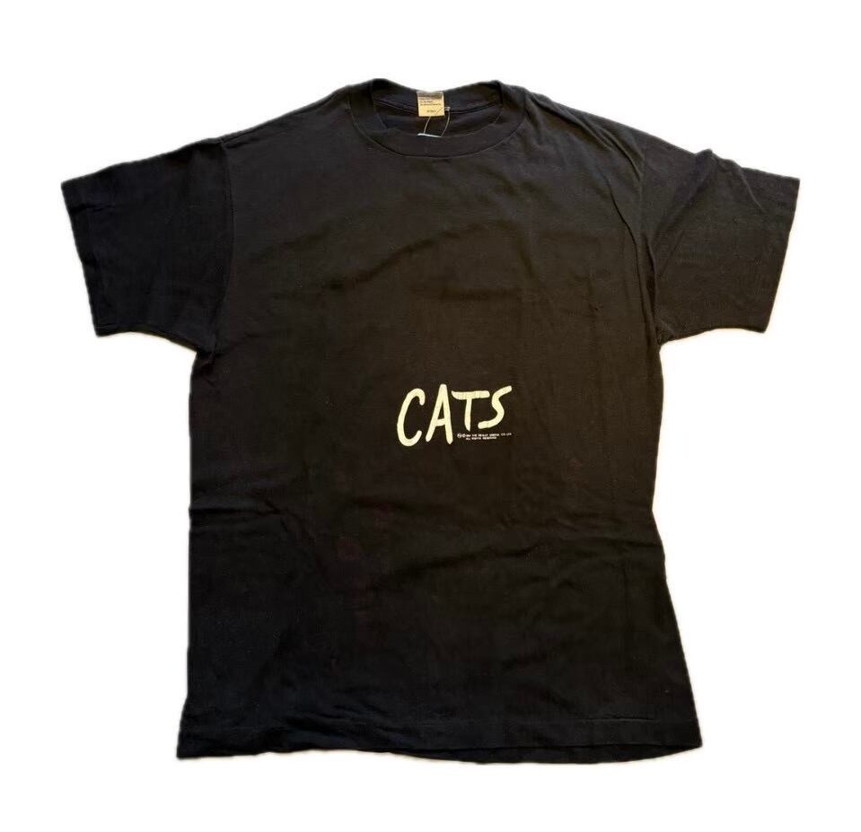 1981年に初演された有名なミュージカル「キャッツ」のビンテージTシャツです。 フロントにはシンプルに「CATS」のロゴが入っており、バックプリントとして印象的な猫の目がデザインされていることが多い、1980年代の非常に人気のあるモデルです。 肩幅約50cm 身幅約53cm 着丈約72cm 袖丈約20cm 20643760